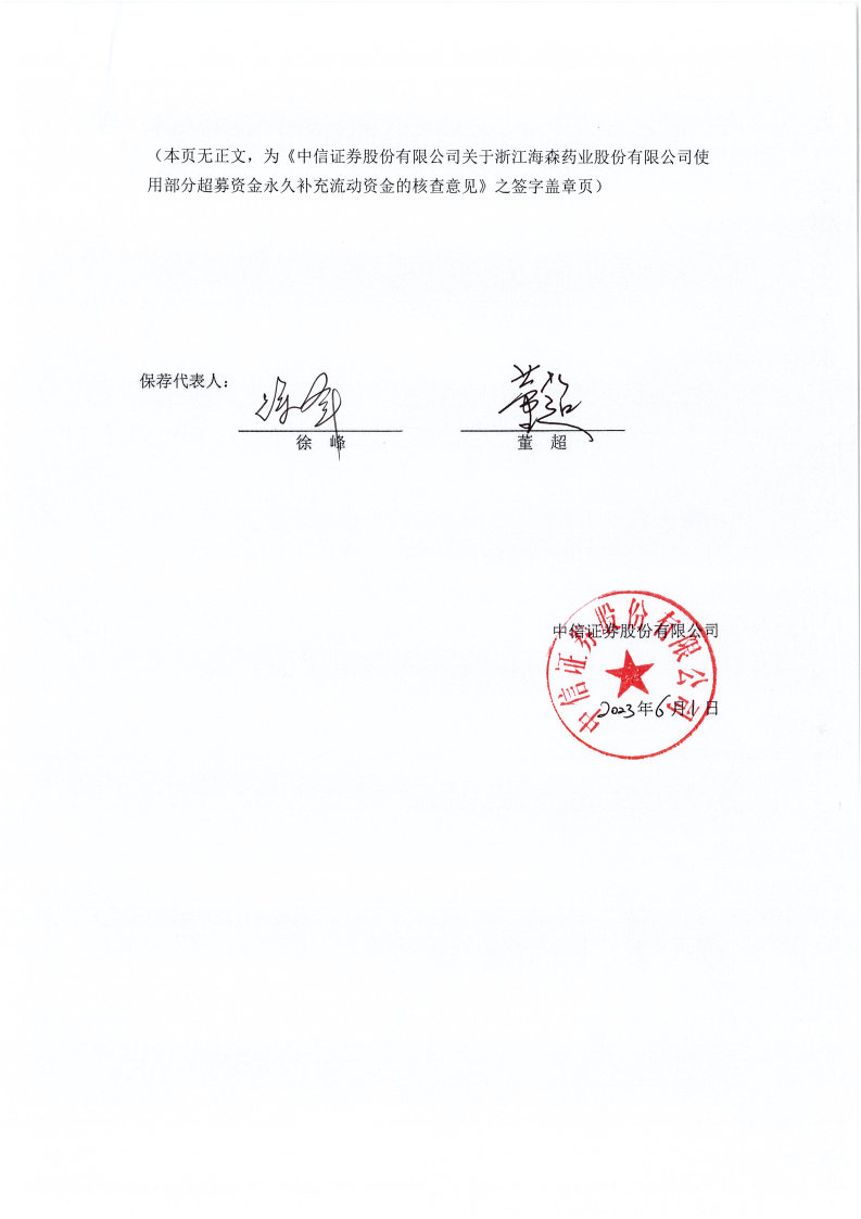 中信證券股份有限公司關(guān)于浙江海森藥業(yè)股份有限公司使用部分超募資金永久補(bǔ)充流動(dòng)資金的核查意見